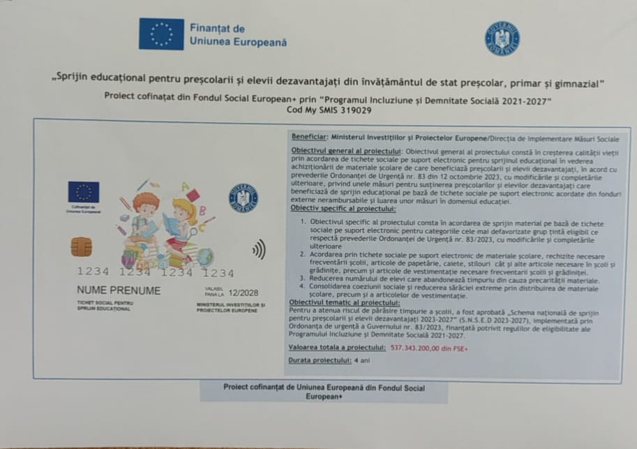 Obiectivul general al proiectului: Obiectivul general al proiectului constă în creșterea calității vieții prin acordarea de tichete sociale pe suport electronic pentru sprijinul educațional în vederea achiziționării de materiale școlare de care beneficiază preșcolarii și elevii dezavantajați, în acord cu prevederile Ordonanței de Urgență nr. 83 din 12 octombrie 2023, cu modificările și completările ulterioare, privind unele măsuri pentru susținerea preșcolarilor și elevilor dezavantajați care beneficiază de sprijin educațional pe bază de tichete sociale pe suport electronic acordate din fonduri externe nerambursabile și luarea unor măsuri în domeniul educației.